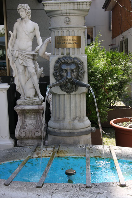 Sobald die ersten Sonnenstrahlen es uns erlauben, verwöhnen wir auch unsere Gäste gerne auf unserer schönen Terrasse, wo sich der Wasserbrunnen befindet.